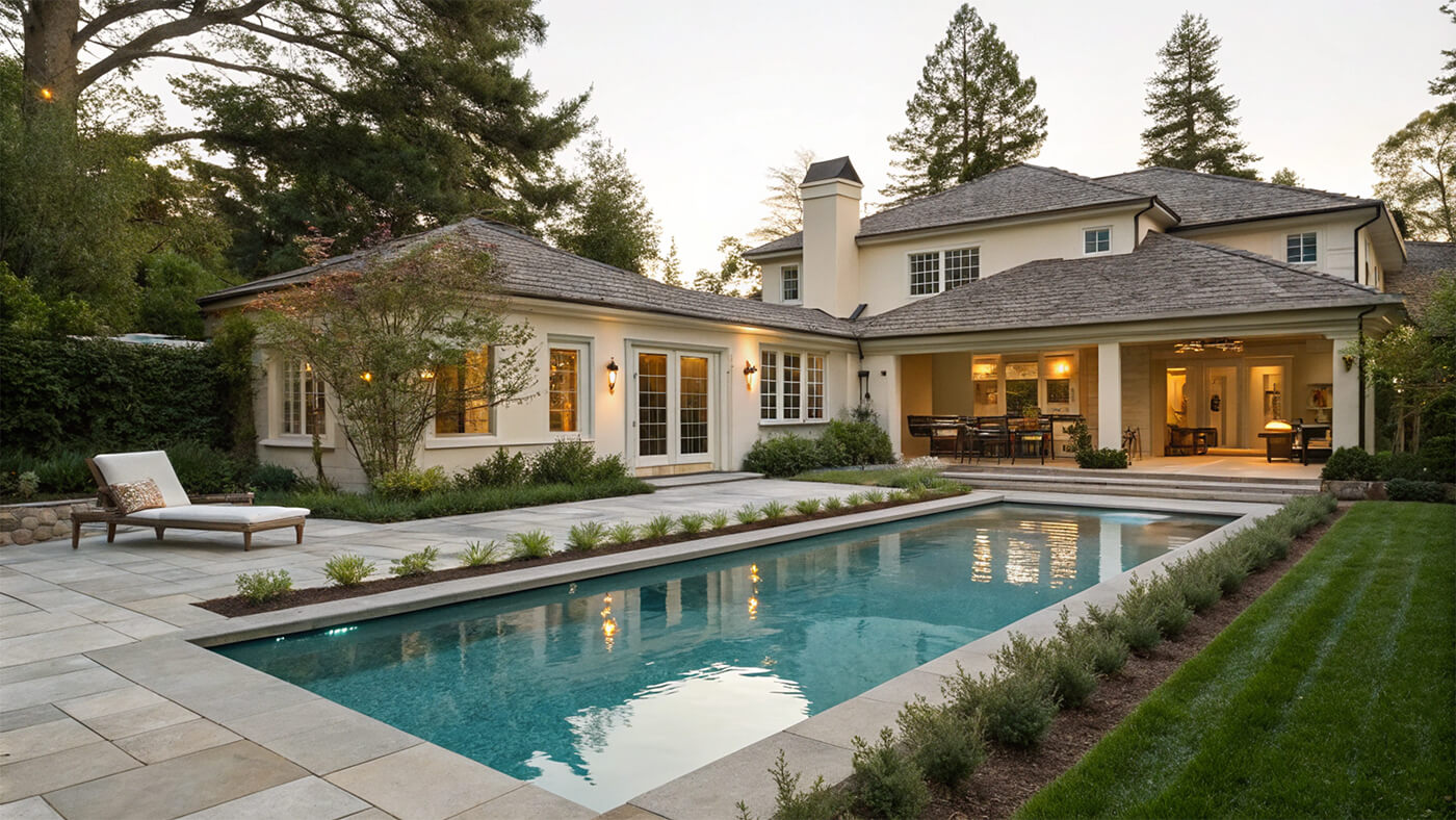 Для широких участков можно выбрать более просторные бассейны любой формы. Это может быть прямоугольный бассейн для плавания или бассейн с интересным дизайном, включающим водопады, мостики и зоны для отдыха.